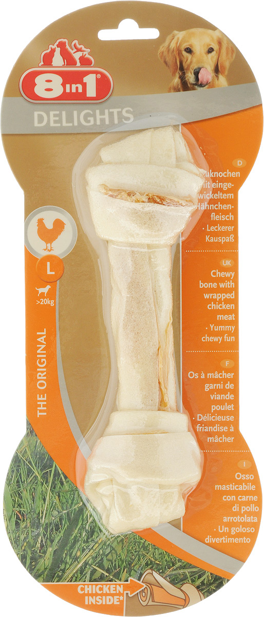 8 in 1 "Delights L" - большое количество качественного куриного мяса, завернутого в жесткую оболочку из сыромятной кожи. Лакомство полезно для зубов и десен, удовлетворяет природный жевательный инстинкт собаки. Лакомство 8 in 1 "Delights L" - долгое "жевательное" удовольствие и никаких остатков. Лакомство изготавливается с учетом размеров собаки. Обогащено полезными минералами. Отбеливает зубы и освежает дыхание. Содержит всего 2% жира и не содержит искусственных красителей и усилителей вкуса.Размер косточки: 5 см х 20 см.Товар сертифицирован.