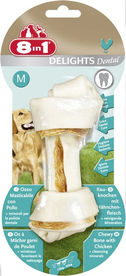 8 in 1 "Dental Delights M" - уникальное запатентованное лакомство с качественным куриным мясом, завернутое в жесткую оболочку из сыромятной кожи. Полезно для зубов и десен. Удовлетворяет природный жевательный инстинкт собаки. Долгое "жевательное" удовольствие и никаких остатков. Изготавливается с учетом размеров собаки. Обогащено полезными минералами. "Dental Delights M" помогает удалить зубной налет, предотвращая образование зубного камня и способствуя свежему дыханию. Содержит всего 2% жира. Не содержит искусственных красителей и усилителей вкуса и аромата. Состав: мясо и мясные субпродукты (куриное мясо 10%), минеральные вещества. Аналитические компоненты: сырой белок - 82%, сырые масла и жиры - 2%, сырая клетчатка - 1%, сырая зола - 2%, содержание влаги - 14%. Вес: 70 г. Размер косточки: 5 см х 15 см. Товар сертифицирован.