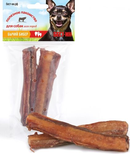 "Бычий Бибер" (бычий корень) от компании Best-in продукт который будет вызывать интерес у вашей собаки, не зависимо, сколько раз она его грызла. Продукт предназначен для удаления зубного камня, развития мышц челюсти, для очистки полости рта. Приготовлен из натурального продукта без консервантов и красителей, имеет приятный запах. Любимое лакомство для собак из серии деликатесы из говядины. Подходит для средних и мелких пород собак как безопасное лакомство, которое можно давать собаки, оставляя ее одну.