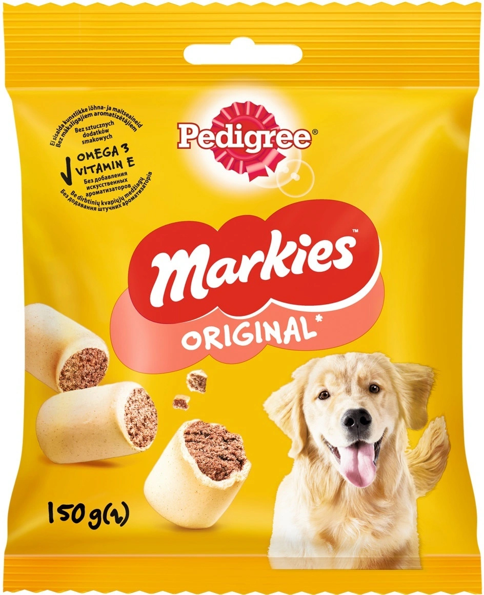 Лакомство для взрослых собак PEDIGREE Markies прекрасно подходит для того, чтобы побаловать собаку. PEDIGREE Markies вкусные хрустящие бисквиты - рулетики с мозговой косточкой хрустящие снаружи и такие вкусные внутри доставит удовольствие вашему питомцу и позаботится о его здоровье. Входящие в состав витамины и микроэлементы помогают поддерживать зубы, кожу и шерсть собаки в отличном состоянии.Рекомендации по кормлению: собаки средних пород (15-24 кг) - не более 5 шт. в неделю, собаки крупных пород (более 25 кг) - не более 11-ти штук в неделю. Необходимо уменьшать суточную норму кормления собаки основным кормом соответственно. Свежая питьевая вода должна быть постоянно доступна.Состав: злаки, мясо и субпродукты (включая 10% мозговой косточки), сахара, масла и жиры, минералы, продукы растительного происхождения, семена и травы.Содержание питательных веществ (100 г): белки – 15,3 г; жиры – 13,8 г; зола - 8,6 г; клетчатка - 2,3 г; кальций - 1,8 г; витамин A - 717,9 МЕ; витамин E - 7,18 мг; моносульфат железа 2,15 мг; омега 3 жирные кислоты - 477 мг/кг. Энергетическая ценность (100 г): 364 ккал.Хранить при температуре от + 4°С до + 35°С и относительной влажности воздуха не более 75 %