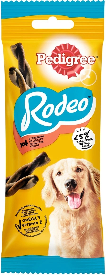 Полезное жевательное лакомство PEDIGREE Rodeo с говядиной прекрасно подходит для того, чтобы побаловать собаку. PEDIGREE Rodeo с говядиной доставит удовольствие вашему питмоцу и позаботится о его здоровье. Вашей собаке понравится скрученная форма косичек и аппетитный вкус говядины. Входящие в состав витамины и микроэлементы помогают поддерживать зубы, кожу и шерсть собаки в отличном состоянии.Рекомендации по кормлению: собаки маленьких пород (4-9 кг) - не более 3 шт. в неделю, собаки средних пород (15-24 кг) - не более 6 шт. в неделю, собаки крупных пород (более 25 кг) - не более 12-ти штук в неделю. Необходимо уменьшать суточную норму кормления собаки основным кормом соответственно. Свежая питьевая вода должна быть постоянно доступна.Содержание питательных веществ (100г): белок - 23,0 г; жир- 3,5 г; зола - 5,7г; клетчатка -1,5 г; влажность - 17,8 г; кальций - 0,75г; моногидрат сульфата сульфат железа - 15,9 мг; витамин А - 529 МЕ; витамин Е - 5,29 мг, омега3 жирные кислоты - 603 мг/кг. Энергетическая ценность: 303 ккал / 1268 кДж.Хранить при температуре от + 4°С до + 35°С и относительной влажности воздуха не более 75 %