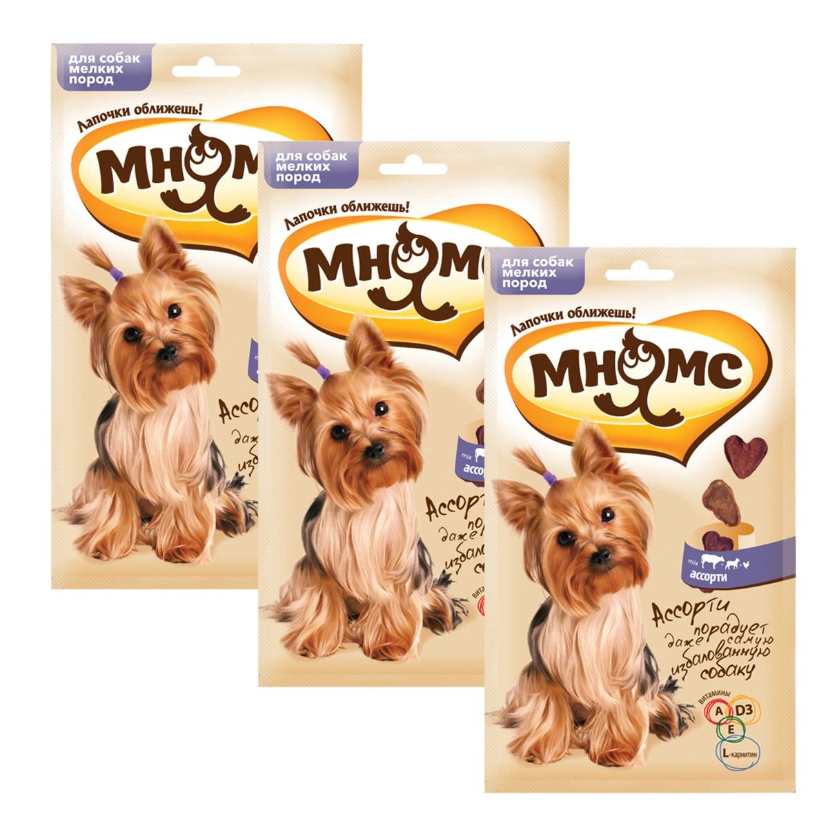 Мнямс ассорти для собак мелких пород говядина, ягненок, курица. Ассорти "Мнямс"- это вкусное и здоровое лакомство с большим содержанием мяса, специально созданное для собак мелких пород. Ассорти состоит из мягких лакомых кусочков разной формы со вкусами говядины, ягненка и курицы, которые придутся по вкусу даже самому капризному любимцу. Лакомство идеально подходит в качестве поощрения для игр и тренировок. Норма употребления: Давать в виде дополнения к основному питанию. Щенкам, начиная с 4-х месяцев – 2-5 кусочков в день; взрослым собакам 5-10 кусочков в день (в зависимости от размера и активности собаки). Свежая вода должна быть всегда доступна вашему питомцу. Правила хранения: Хранить в сухом прохладном месте, вдалеке от сильно пахнущих продуктов. После вскрытия упаковки употребить в течение 4-5 дней.