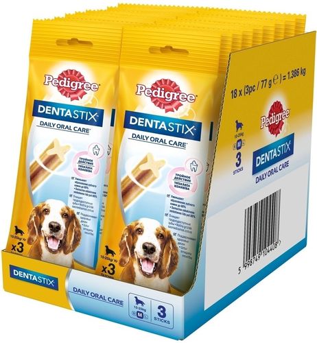 Это полезное лакомство от Pedigree® заботится осостоянии полости рта вашей собаки, для ее долгой и здоровой жизни. X-образная форма и особая текстура Denta Stix от Pedigree® помогают эффективно очищать зубы и массировать десны собаки, а слюна, которая выделяется при жевании, удаляет остатки пищи. Сульфат цинка, в составе Denta Stix от Pedigree®, замедляет формирование зубного камня и позволяет легко удалить его во время жевания, а триполифосфат натрия не позволяет кальцию откладываться на зубахБольшинство собак старше 3 лет страдают заболеваниями зубов и десен. Pedigree® рекомендует давать собаке Denta Stix maxi, так как он не только механически чистит зубы, но и содержит активные компоненты, которые предотвращают риск развития заболевании? полости рта.Клинически доказано, что ежедневное использование Denta Stix от Pedigree® до 80% уменьшает образование зубного камня, предотвращая риск развития заболеваний.Нужно помнить, что Вы можете чистить собаке зубы с помощью зубной щетки или ежедневно давать ей лакомство по уходу за зубами Denta Stix от Pedigree®. Кроме того, у вашей собаки всегда должен быть доступ к чистой питьевой воде.Для собак средних пород, например, кокер-спаниель - одна палочка в день. Не подходит для щенков моложе 4-х месяцев.Состав: злаки, продукты растительного происхождения, минералы (включая 2,7% триполифосфат натрия), мясо и субпродукты, масла и жиры.Содержание питательных веществ (100 г): белок - 7,0 г; жир - 1,7 г; влажность - 14,0 г; зола - 6,0 г; клетчатка - 1,0 г; сульфат цинка - 1055 мг/кг; витамин Е - 1365 мг/кг; ароматизатор натуральный куриный - 45,9 мг/кг. Энергетическая ценность (100 г): 305 ккал / 1276 кДж.