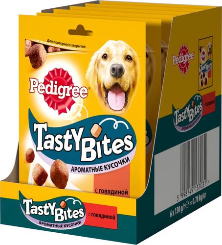 Ароматные кусочки Pedigree Tasty Bites с говядиной — отличное угощение в любое время.Аппетитные маленькие ломтики идеально подходят, чтобы побаловать вашего любимца. В состав Pedigree Tasty Bites входит кальций, который поддерживает здоровье костей, витамины, обеспечивающие естественную защиту, и омега 3 для активной жизни вашего любимца.Упаковку Pedigree Tasty Bites с замком можно открывать и закрывать когда удобно.Собаки миниатюрных пород(2-3 кг) не более 2-х штук в день,собаки маленьких пород(4-9 кг) не более 3-х штук в день, собаки средних пород(10-15 кг)не более 7-и штук в день, собаки средних и крупных пород(16-24 кг)не более 10-и штук в день, собаки крупных пород(больше 25 кг) не более 14-и штук в день. Необходимо уменьшать суточную норму кормления собаки, соответственно. У собаки постоянно должна быть свежая питьевая вода.