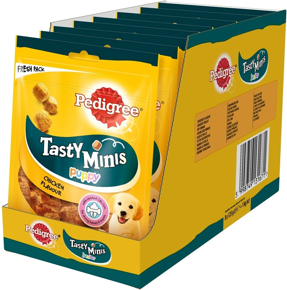 Ароматные кусочки PEDIGREE Tasty Minis с курицей идеально подходят, чтобы баловать, тренировать и поощрять щенка в любое время. Маленькими кусочками PEDIGREE Tasty Minis вашему щенку так удобно лакомиться! В их состав входит кальций для укрепления зубов и костей, диетические пищевые волокна для поддержания здорового пищеварения, комплекс витаминов и минералов для обеспечения природной защиты организма и омега 3 для активной жизни вашего любимца. Упаковку PEDIGREE Tasty Minis с замком можно открывать и закрывать когда удобно.Щенки миниатюрных пород (2-3кг) - не более 8 штук в день, щенки маленьких пород (4-9кг) - не более 14 штук в день, щенки средних пород (10-15кг) - не более 41-ой штуки в день, щенки средних и крупных пород (15-24кг) - не более 56 штук в день, щенки крупных пород (больше 25кг) - не более 81 штук в день. Необходимо уменьшать суточную норму кормления, соответственно. У собаки постоянно должна быть свежая питьевая вода. Подходит для щенков в возрасте от 4-х до 18-ти месяцев.Состав: злаки, мясо и субпродукты (в том числе 13% курицы), продукты растительного происхождения, минеральные вещества, семена, масла и жиры, травы.Содержание питательных веществ (100г): белки – 20,3 г; жиры – 10,3 г; зола - 7,1 г; клетчатка - 2,2 г; кальций - 1,3 г, влажность – 14 г; витамин A – 50 МЕ; Витамин E - 5 мг; моногидрат сульфата железа - 15 мг; омега 3 жирные кислоты - 1733 мг/кг. Энергетическая ценность (100 г): 342 ккал.