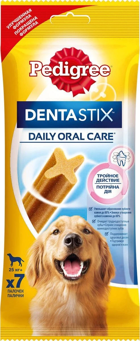 Собакам необходим ежедневный уход за полостью рта. Pedigree "Denta Stix" - это вкусное лакомство на каждый день, которое не только очищает зубы, но и укрепляет десны и освежает дыхание. Благодаря своей уникальной форме, Pedigree "Denta Stix" уменьшит у вашего любимца зубной камень до 80%. "Denta Stix" - это уникальная возможность ухаживать за зубами собаки во время еды. Структура Pedigree "Denta Stix" имеет Х-образный профиль. Чтобы разжевать косточку, собака должна прилагать усилия, что помогает удалить налет. Pedigree "Denta Stix" разжевываются в течение довольно долгого времени. Дополнительное преимущество продолжительного жевания состоит в том, что оно стимулирует выделение слюны. Слюна помогает вымывать остатки пищи и удалять их с зубов. Состав: злаки, продукты растительного происхождения, минералы, мясо и субпродукты, белковые растительные экстракты, масла и жиры, ароматизатор куриный натуральный (43,6 г). Анализ: белок - 9,5 г, жир - 2,6 г, клетчатка - 2,4 г, зола - 6,1 г, влажность - 8 г, триполифосфат натрия - 2,4 г, сульфат цинка - 104,5 мг. Вес: 270 г. Товар сертифицирован.