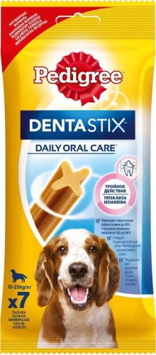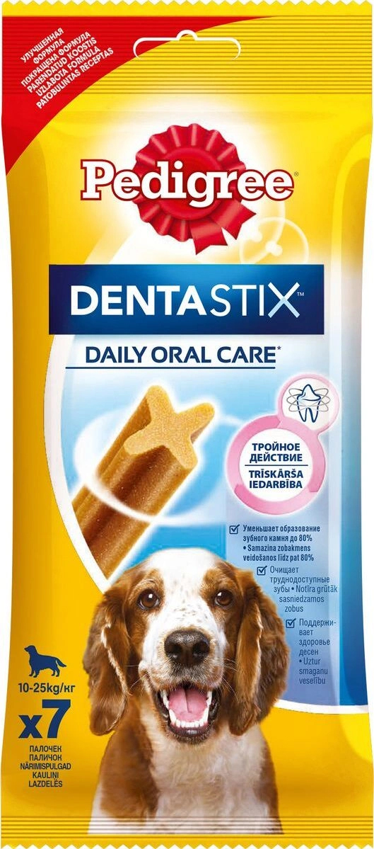 Собакам необходим ежедневный уход за полостью рта. Pedigree "Denta Stix" - это вкусное лакомство на каждый день, которое не только очищает зубы, но и укрепляет десны и освежает дыхание. Благодаря своей уникальной форме, Pedigree "Denta Stix" уменьшит у вашего любимца зубной камень до 80%. "Denta Stix" - это уникальная возможность ухаживать за зубами собаки во время еды. Структура Pedigree "Denta Stix" имеет Х-образный профиль. Чтобы разжевать косточку, собака должна прилагать усилия, что помогает удалить налет. Pedigree "Denta Stix" разжевываются в течение довольно долгого времени. Дополнительное преимущество продолжительного жевания состоит в том, что оно стимулирует выделение слюны. Слюна помогает вымывать остатки пищи и удалять их с зубов. Состав: Состав: злаки, продукты растительного происхождения, минералы, мясо и субпродукты, белковые растительные экстракты, масла и жиры, ароматизатор куриный натуральный (43,6 г). Анализ: белок - 9 г, жир - 2,6 г, клетчатка - 2,4 г, зола - 6,1 г, влажность - 8 г, триполифосфат натрия - 2,4 г, сульфат цинка - 104,5 мг. Вес: 180 г. Товар сертифицирован.