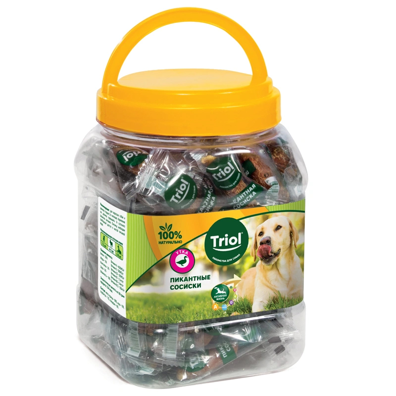 Пикантные сосиски из утки – это незаменимое лакомство для активного отдыха с вашим любимцем, которое подарит заряд бодрости и энергии благодаря повышенному содержанию витаминов B1, B6, B12 и L-карнитина. Сосиски расфасованы в пластиковые банки, при этом каждая сосиска упакована в индивидуальный пакетик со штрихкодом и всей необходимой информацией о продукте. Таким образом, потребитель может выбрать: покупать целую банку или поштучно. Банку с эргономичной ручкой удобно хранить и легко транспортировать. Вес нетто 500г. В банке 65-72 сосиски.