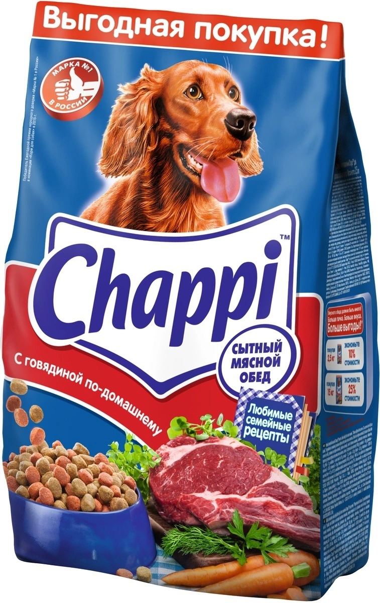 Сухой корм Chappi "Сытный мясной обед" - это специально разработанная еда для собак с оптимально сбалансированным содержанием белков, витаминов и микроэлементов. Уникальная формула "Chappi" включает в себя все необходимые для здоровья компоненты: - мясо - для силы и энергии в течение дня; - овощи, травы и злаки - для отличного пищеварения; - масла и жиры - для блестящей шерсти и здоровой кожи; - кальций - для крепких зубов и костей; - витамины - для защиты здоровья; - минералы - для подержания собаки в оптимальной форме. Корм "Chappi" идеально подходит для вашего любимца как надежный источник жизненных сил. Состав: злаки, мясо и субпродукты, жиры животного происхождения, морковь, люцерна, растительные масла, минеральные вещества, витамины. Пищевая ценность в 100 г: белок - 18 г, жиры - 10 г, клетчатка - 7 г, влажность - не более 10 г, зола - 7 г, кальций - 0,8 г, фосфор - 0,6 г, витамин А - 500 МЕ, витамин D - 50 МЕ, витамин Е - 8 мг, витамины В2, В12, пантотеновая и никотиновая кислоты. Энергетическая ценность в 100 г: 350 ккал. Вес: 2,5 кг. Товар сертифицирован.