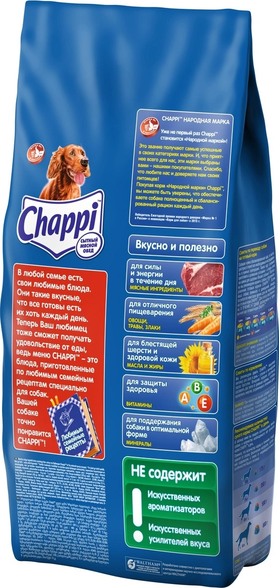 Сухой корм Chappi "Сытный мясной обед" - это специально разработанная еда для собак с оптимально сбалансированным содержанием белков, витаминов и микроэлементов. Уникальная формула "Chappi" включает в себя все необходимые для здоровья компоненты: - мясо - для силы и энергии в течение дня; - овощи, травы и злаки - для отличного пищеварения; - масла и жиры - для блестящей шерсти и здоровой кожи; - кальций - для крепких зубов и костей; - витамины - для защиты здоровья; - минералы - для подержания собаки в оптимальной форме. Корм "Chappi" идеально подходит для вашего любимца как надежный источник жизненных сил. Состав: злаки, мясо и субпродукты, жиры животного происхождения, морковь, люцерна, растительные масла, минеральные вещества, витамины. Пищевая ценность в 100 г: белок - 18 г, жиры - 10 г, клетчатка - 7 г, влажность - не более 10 г, зола - 7 г, кальций - 0,8 г, фосфор - 0,6 г, витамин А - 500 МЕ, витамин D - 50 МЕ, витамин Е - 8 мг, витамины В2, В12, пантотеновая и никотиновая кислоты. Энергетическая ценность в 100 г: 350 ккал. Вес: 15 кг. Товар сертифицирован.