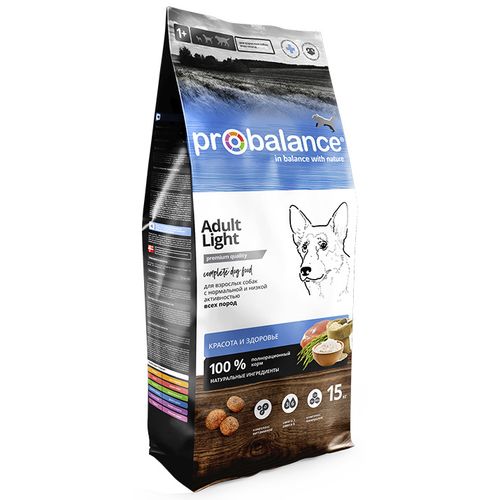 Полнорационный натуральный сухой корм премиум класса для собак с избыточным весом или низкой активностью. Корм рекомендован для ежедневного кормления взрослых собак всех пород. Корм Probalance Adult Light разработан датскими ветеринарами. Баланс питательных веществ способствует снижению веса у собак с массой тела выше нормы и помогает поддерживать идеальный вес у собак с нормальной или низкой активностью. В рецептуру входят только натуральные ингредиенты без Е-консервантов. Оптимальный уровень содержания белка помогает поддерживать мышечную массу. Несколько видов натуральных пищевых волокон стимулируют пищеварение и способствуют здоровью кишечника. L-карнитин улучшает транспорт жирных кислот в митохондрии, тем самым стимулирует сжигание жиров в организме. Глюкозамин и хондроитин помогают сохранить суставы здоровыми. Комплекс натуральных антиоксидантов защищает клетки организма от вредных продуктов окисления.Состав: Дегидратированное мясо птицы (22 %), рис, ячмень, отруби пшеничные, овес, жом свекловичный, куриный жир, натуральные вкусоароматические добавки, дрожжи (источник витаминов группы В), масло подсолнечное, яичный порошок, витаминно-минеральная добавка для собак (витамины А, D3, Е, В1, В2, В3, В4, В5, В6, В9 (фолиевая кислота), В12, Н (биотин), железо, медь, цинк, марганец, йод, селен), жир рыбий, фито-композиция из целебных трав «Fitocare® for dogs», лецитин (необходим для восстановления клеток организма), лизин (помогает укреплять иммунитет), глюкозамин, хондроитин (здоровая работа суставов), L-карнитин (способствует сжиганию жиров в организме). Добавки, сохраняющие продукт: мико карб, натуральные антиоксиданты (смесь токоферолов). Энергетическая ценность: 337 ккал / 100 г.Гарантированные показатели: сырой протеин - 22%, сырой жир - 10%, сырая клетчатка - 5%, сырая зола - 6%, кальций – 1,2%, фосфор - 0,8%, влажность - 10%, витамин А - 15000 МЕ/кг, витамин D - 1500 МЕ/кг, витамин Е – 50 мг/кг