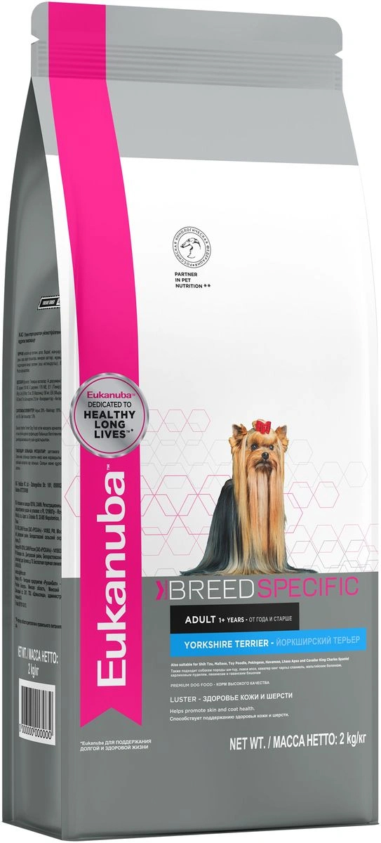 EUK Dog DNA корм для йорков 2 кг. Полноценный сбалансированный корм, специально разработанный для взрослых собак породы йоркширский терьер, а также подходящий для кормления собак пород кавалер-кинг-чарльз спаниель, ши-тцу, карликовых и той-пуделей. Основным компонентом корма является мясо. Содержит минералы для крепких зубов, витамин Е и бета-каротин для естественной защитной силы организма, умеренно ферментируемую клетчатку (пульпа сахарной свеклы), способствующую эффективному всасыванию питательных веществ, и оптимальный баланс жирных кислот Омега-6 и Омега-3, помогающих сохранить здоровые кожу и шерсть. В состав корма входит система защиты зубов 3 Denta Defence. Не содержит искусственных красителей и ароматизаторов. Содержит разрешенные ЕС антиоксиданты (токоферолы). Нормы кормления указаны на упаковке. У животного всегда должна быть свежая вода. Срок годности указан на упаковке. Хранить в сухом и прохладном месте. Анализ: Белок 28,0 %, Жир 18,0 %, Пищевая клетчатка 1,9 %, Минеральные вещества 6,6 %, дегидратированные белки животного происхождения (птица), ячмень, пшеница, животные жиры, пшеничная мука, рис, растительная клетчатка, минеральные вещества, яичный порошок, гидролизат белков животного происхождения (вкусоароматические добавки), рыбий жир, фруктоолигосахариды. ДОБАВЛЕННЫЕ ВЕЩЕСТВА (в 1 кг): Витамин A: 17500 ME; Витамин D3: 1100 ME; Витамин E: 176 ME; Железо: 43 мг; Йод: 4,3 мг; Медь: 13 м; Марганец: 56 мг; Цинк: 168 мг; Ceлeн: 0,11 мг. индивидуальная непереносимость. Нормы кормления: 20 кг - 210-230 г, 25 кг - 240-270 г, 30 кг - 275-305 г, 35 кг - 305-335 г, 40 кг - 330-370 г, 45 кг - 360-400 г. Корм готов к употреблению. Проследите, чтобы у вашего животного всегда была свежая вода. Номер серии, регистрационный номер завода-изготовителя и срок годности указаны на упаковке.