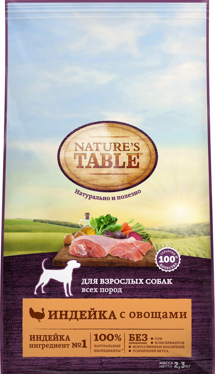 Натурально и полезно! Рацион для взрослых собак всех пород Nature`s Table "Индейка с овощами" содержит на 100% натуральные ингредиенты самого высокого качества, получаемые от проверенных поставщиков: - ингредиент №1 – индейка – источник животного белка с высокой усвояемостью, диетическое мясо, является основой здорового рациона собаки; - подсолнечное масло и рыбий жир – источники омега-3 и омега-6 кислот, витаминов А, D, E для поддержания естественного здоровья кожи и блестящей шерсти; - натуральные овощи и злаки содержат легкоусвояемые углеводы, минералы и витамины группы В для здорового пищеварения и поддержания микрофлоры кишечника; - БЕЗ сои, искусственных красителей, усилителей вкуса и консервантов. Вся польза природы – для вашей собаки, чтобы она радовала вас здоровьем и красотой каждый день! Сухой полнорационный корм, предназначенный специально для взрослых собак всех пород старше 1 года. Рекомендации по дневной норме питания, при условии кормления только сухим кормом: - вес взрослой собаки 10 кг – 139 г; - вес взрослой собаки 15 кг – 188 г; - вес взрослой собаки 20 кг – 233 г; - вес взрослой собаки 25 кг – 273 г; - вес взрослой собаки 30 кг – 315 г; - вес взрослой собаки 35 кг – 355 г; - вес взрослой собаки 40 кг – 392 г; - вес взрослой собаки 45 кг – 427 г; - вес взрослой собаки 50 кг – 463 г; При переходе на натуральное питание Nature`s Table для взрослых собак всех пород старше 1 года, постепенно вводите его в рацион собаки в течение 6 дней. Мы рекомендуем кормить вашу собаку 2 раза в день. Разделите дневную норму, указанную выше, на количество кормлений в день. Индивидуальная норма кормления вашей собаки может изменяться, в зависимости от ее возраста, условий содержания, темперамента и активности. У вашей собаки всегда должен быть доступ к свежей питьевой воде. Состав: индейка, пшеница, кукуруза, рис, бульон, масла и жиры (животный жир, подсолнечное масло, рыбий жир), овощи и зелень (сухая мякоть сахарной свеклы, горошек, морковь, шпинат, цикорий), лосось, витамины и минералы, соль, куриное яйцо. Не содержит сои, искусственных красителей, усилителей вкуса и консервантов. Содержание питательных веществ (в 100 г): белки – 27 г; жиры – 17 г; зола – 8 г; влажность – 8,5 г; клетчатка – 2,6 г; витамин А - 1500 МЕ; витамин D3 - 157 МЕ; витамин Е - 12,5 мг. Энергетическая ценность (100 г): 386 ккал / 1616 кДж.