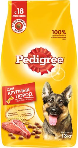 Сухой корм для собак "Pedigree" - полнорационный сухой корм для взрослых собак крупных пород больше 25 кг. Содержит все необходимые вещества для поддержания хорошей физической формы собак и естественного здоровья их суставов.Особенности: Крепкие зубы. Оптимальный уровень кальция для укрепления зубов. Здоровье кожи и шерсти. Линолевая кислота, цинк и витамины В необходимы для здоровья кожи и шерсти. Отличное пищеварение. Высокоусвояемые ингредиенты и клетчатка для оптимального пищеварения. Поддержка иммунной системы. Витамин Е и цинк поддерживают иммунную систему. Для поддержания естественного здоровья суставов собак продукт содержит комплекс полинасыщенных жирных кислот Омега-3, Омега-6 и глюкозамин. Состав: куриная мука, пшеница, рис, свекольный жом, кукуруза, мясная мука (в том числе говядина минимум 4%), подсолнечное масло, жир животный, пивные дрожжи, минералы, витамины, глюкозамин. Пищевая ценность (100 г): белки - 22 г; жиры - 12 г; зола - 7 г; влага - не более 10 г; клетчатка - 4 г; кальций - 1,3 г; фосфор - 0,8 г; натрий - 0,3 г; калий - 0,58 г; магний - 0,1 г; цинк - 20 мг; медь - 1,5 мг; витамин А - 1500 МЕ; витамин D3 - 120 МЕ; а также витамины В1, В2, В4, В5, В12; ниацин; омега-6, омега-3 полинасыщенные жирные кислоты; глюкозамин. Энергетическая ценность (100 г): 360 ккал/1507 кДж. Вес: 13 кг. Товар сертифицирован.
