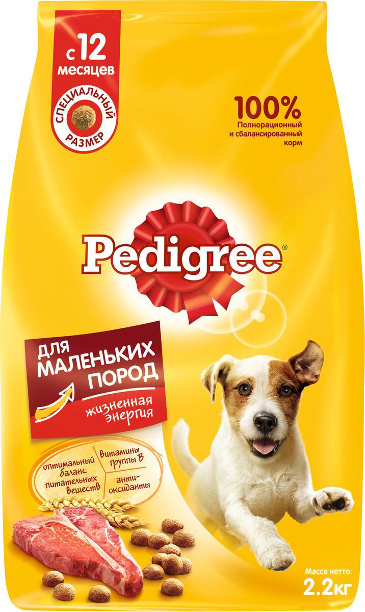Сухой корм "Pedigree" для взрослых собак весом меньше 15 кг - это полнорационный корм с говядиной, который предназначен для взрослых собак маленьких и карликовых пород. Он состоит из качественных и натуральных ингредиентов: мяса, овощей, злаков. Корм способствует здоровому росту и гармоничному развитию вашего питомца. Он создан с учетом особенностей пищеварения собаки, легко усваивается и обеспечивает правильную работу желудочно-кишечного тракта. Состав: кукуруза, рис, пшеница, куриная мука, мясная мука (в том числе говядина минимум 4%), свекольный жом, подсолнечное масло, жир животный, пивные дрожжи, витамины и минералы. Пищевая ценность (100 г): белки 21 г, жиры 14 г, зола 7 г, клетчатка 4 г, влажность не более 10 г, кальций 1,3 г, фосфор 0,8 г, натрий 0,3 г, калий 0,58 г, магний 0,1 г, цинк 20 г, медь 1,5 г, витамин А 1500 МЕ, витамин Е 20 мг, витамин D3 120 МЕ, витамины B1, B2, B4, B5, B12, ниацин, омега-6, омега-3, полиненасыщенные жирные кислоты. Энергетическая ценность (100 г): 365 ккал. Вес: 2,2 кг. Товар сертифицирован.