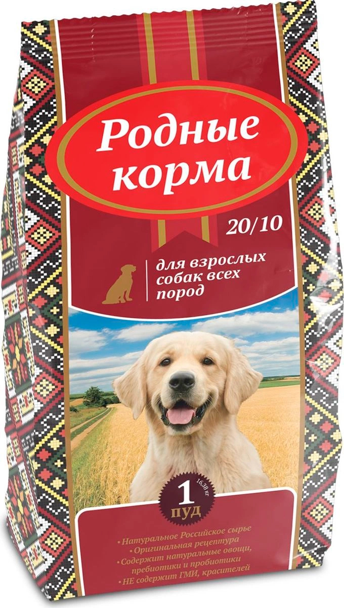В производстве сухого корма для собак "Родные корма" используются только натуральные продукты, произведенные на территории нашей страны, а также оригинальная российская рецептура с массой полезных добавок (фрукты и овощи а так же пре- и пробиотики) адаптированная специально под содержание собак в нашей стране. Покупая "Родные корма" для собак, вы можете быть уверены, что приобретаете полноценный сбалансированный корм высокого качества. Ингредиенты: злаки (кукуруза, пшеница) мука из мяса курицы, жир куриный, диетические волокна, дрожжи, Bacillus subtillis, Bacillus licheniformis, тыква сушенная, лизин, DL-метионин, минеральные вещества, антиоксиданты, комплекс витаминов. Гарантируемые показатели питательной ценности: протеин — 20%, жиры – 10%, зола — 7%, клетчатка – 3%, кальций — 1,3%, фосфор – 1%, влажность не более — 10%, витамины: А — 8 400 МЕ/кг, Д3 — 800 МЕ/кг, Е — 80 мг/кг. Энергетическая ценность: 3500 ккал/кг. Товар сертифицирован.