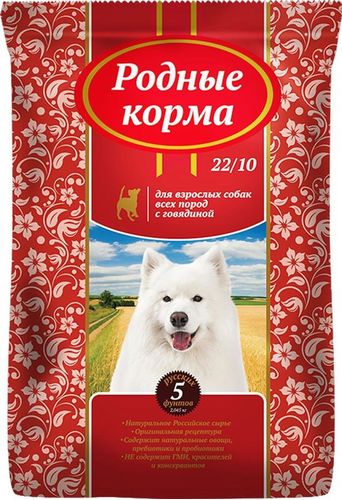 Родные корма для собак 22/10 ГовядинаИнгредиенты: мука из мяса (говядины не менее 14%, курицы 8%) кукуруза, пшеница, жир куриный, диетические волокна, дрожжи, пробиотический комплекс: Bacillus subtillis, Bacillus licheniformis, тыква сушенная, яблоки сушенные, лизин, DL-метионин, минеральные вещества, антиоксиданты, комплекс витаминов.Гарантируемые показатели питательной ценности:Протеин — 22%, жиры – 10%, зола — 7%, клетчатка – 3%, кальций — 1,3%, фосфор – 1%, влажность не более — 10%, витамины: А — 8 400 МЕ/кг, Д3 — 800 МЕ/кг, Е — 80 мг/кг.Энергетическая ценность: 3500 ккал/кг.Рекомендации по применению: корм подается в сухом виде или размоченный в теплой воде. У животного всегда должен быть доступ к свежей питьевой воде. Корм следует вводить в рацион постепенно в течение 7-10 дней.Рекомендуемое количество сухого корма в день, г. Вес взрослого животного, кг Норма кормления 4 -10 150 — 20015-20 300 — 40025-30 450 — 54035-40 620 — 70045-50 750 — 85055-60 850 – 92065-70 950 – 98070+ 980+ Рекомендуемое количество корма в день является ориентировочным и может меняться в зависимости от индивидуальных особенностей животного, времени года и физической активности.Условия хранения: хранить в сухом месте при относительной влажности воздуха не более 75% . Беречь от солнечных лучей и влаги.Срок годности: 18 месяцев с даты выработки.Корм не содержит искусственных красителей, ароматизаторов, ГМИ.ГОСТ Р 55453-2013Произведено:ООО «Лимкорм»Белгородская обл, г. ШебекиноРжевское шоссе 29А.Знаки на упаковку: РСТ, пелтя мебиуса, беречь от влаги и солнечных лучей.