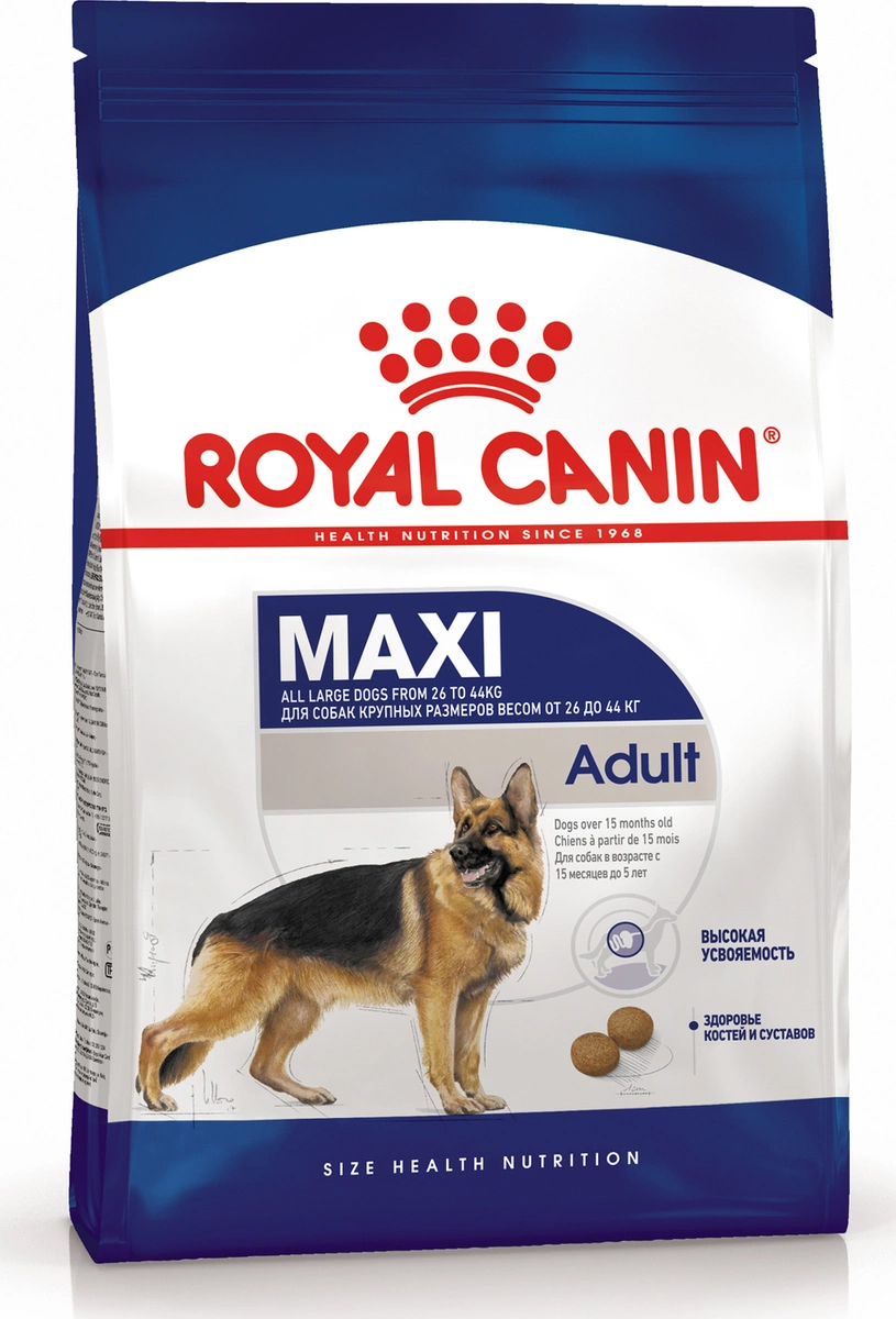 Полнорационный сухой корм Royal Canin "Maxi Adult" предназначен для взрослых собак крупных размеров (вес собаки от 26 до 44 кг) в возрасте от 15 месяцев до 5 лет. Корм способствует оптимальному перевариванию пищи благодаря эксклюзивной рецептуре с очень высоким содержанием белков и сбалансированным количеством пищевых волокон. Поддерживает кости и суставы собак крупных пород при повышенных нагрузках. Вызывает хороший аппетит у собак крупных пород благодаря тщательно подобранным натуральным вкусам и ароматам. Рацион обогащен жирными кислотами Омега-3 (EPA-DHA) для сохранения здоровой кожи. Состав: кукуруза, дегидратированные белки животного происхождения (птица), кукурузная мука, животные жиры, дегидратированные белки животного происхождения (свинина), гидролизат белков животного происхождения, свекольный жом, кукурузная клейковина, минеральные вещества, рыбий жир, соевое масло, дрожжи, гидролизат из панциря ракообразных (источник глюкозамина), гидролизат из хряща (источник хондроитина). Добавки (в 1 кг): витамин A 15500 ME, витамин D3 1000 ME, железо 37 мг, йод 3,7 мг, марганец 48 мг, цинк 145 мг, сeлeн 0,06 мг. Технологические добавки: клиноптилолит осадочного происхождения 5 г, сорбат калия, пропилгаллат, БГА. Содержание питательных веществ: белки 26%, жиры 17%, минеральные вещества 6,5% - клетчатка пищевая 1,2% в 1 кг. Жирные кислоты Омега 3 7,7 г, в том числе жирные кислоты EPA и DHA 4 г, медь 15 мг. Товар сертифицирован. Уважаемые клиенты!Обращаем ваше внимание на то, что упаковка может иметь несколько видов дизайна. Поставка осуществляется в зависимости от наличия на складе.