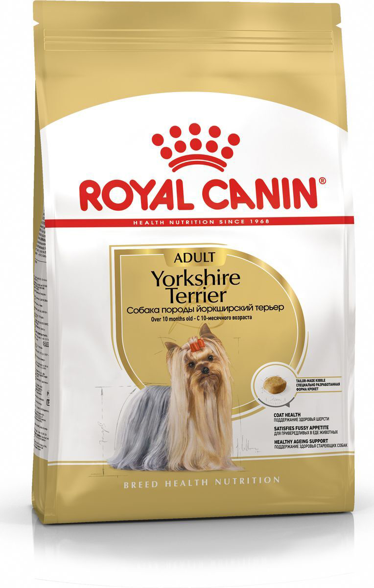 Корм сухой Royal Canin "Yorkshire Terrier Adult" - полнорационный корм для собак породы йоркширский терьер в возрасте от 10 месяцев. Йоркширский терьер — это сказочное создание, которое очаровывает с первой минуты знакомства с ним. Тоненькие, хрупкие и изящные йорки в силу своей физиологии нуждаются в максимальном поступлении в организм аминокислот, необходимых для развития шерсти и ее быстрого роста. Многие корма для йорков имеют крокеты слишком крупного размера, тогда как продукция Royal Canin Yorkshire Terrier Adult разработана специально для небольших челюстей этих собак. Здоровая шерсть. Эта эксклюзивная формула поддерживает здоровье и красоту шерсти йоркширского терьера. Корм обогащен жирными кислотами Омега-3 (EPA и DHA) и Омега-6, маслом бурачника и биотином. Вкусовая привлекательность. Благодаря высокой вкусовой привлекательности корм способен удовлетворить потребности даже самых привередливых питомцев. Долголетие. Особый комплекс с питательными веществами помогает сохранить здоровье собаки в зрелом возрасте и способствует долголетию. Профилактика образования зубного камня. Благодаря хелаторам кальция и специально подобранной текстуре крокет, которая оказывает чистящее воздействие, корм помогает ограничить образование зубного камня. Состав: дегидратированные белки животного происхождения (птица), рис, кукурузная мука, животные жиры, изолят растительных белков, свекольный жом, гидролизат белков животного происхождения, минеральные вещества, соевое масло, рыбий жир, дрожжи, фруктоолигосахариды, гидролизат дрожжей (источник мaннановых олигосахаридов), масло огуречника аптечного (0,1 %), экстракт бархатцев прямостоячих (источник лютеина). Добавки (в 1 кг): йод — 5,2 мг, селен — 0,28 мг, медь — 15 мг, железо — 166 мг, марганец — 73 мг, цинк — 218 мг, витамин A — 31000 МЕ, витамин D3 — 800 МЕ, витамин E — 600 мг, витамин C — 300 мг, витамин B1 — 27 мг, витамин B2 — 48,6 мг, витамин B3 — 482,8 мг, витамин B5 — 145,2 мг, витамин B6 — 75,7 мг, витамин B12 — 0,13 мг. Товар сертифицирован.