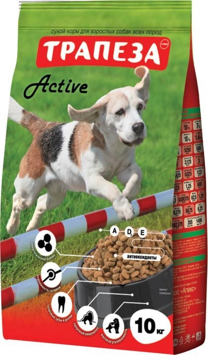 Сухой корм для собак «Трапеза active» — специально разработан для повседневного кормления активных собак средних пород, с повышенными физическими нагрузками. Основным ингредиентом сухого корма «Трапеза active» является печень — источник легкоусвояемого животного протеина, витамины группы В, витамины А и С, фолиевая кислота, микроэлементы: медь, кальций, железо, натрий, фтор, цинк, аминокислоты: триптофан, метионин, лизин. Корм так же содержит яблоки и экстракт розмарина. Яблоки благодаря большому содержанию пектиновых веществ, значительно снижают уровень холестерина в организме животных, что является важным профилактическим действием атеросклероза. Кроме того, пектины способствуют нейтрализации и выведению токсических веществ из организма, образующихся в кишечнике. Розмарин является источником более 12 видов антиоксидантов, включая и самый мощный — розмариновую кислоту. Это растение обладает противовоспалительным эффектом, нейтрализует действие свободных радикалов, содержит минералы, необходимые для укрепления иммунитета: железо, магний, фосфор, калий, натрий и цинк, и обладает замечательными тонизирующими свойствами, благотворно влияющими на пищеварение собаки. Специальная форма и структура гранул разработана с учетом строения челюстей взрослой собаки и позволяет животному в полной мере насладиться своим завтраком, обедом или ужином и не чувствовать после еды дискомфорт в желудке, а так же избежать проблем с пищеварением. Поддержание жизненной энергии – выверенное и подобранное содержание питательных веществ помогает поддерживать нормальное функционирование организма взрослых собак на протяжении всей жизни питомца. Сбалансированный минеральный комплекс – позволяет поддерживать кости и суставы животного в рабочем состоянии и защищать их при повышенных нагрузках. Отличная усвояемость достигается за счет особой рецептуры, в которую входят высоко-усвояемые белки, высококачественные жиры и сбалансированное содержание пищевых волокон. Все сухие корма Трапеза снижают риск возникновения аллергических реакций благодаря отсутствию искусственных красителей и антиоксидантным свойствам витамина Е- натурального консерванта.