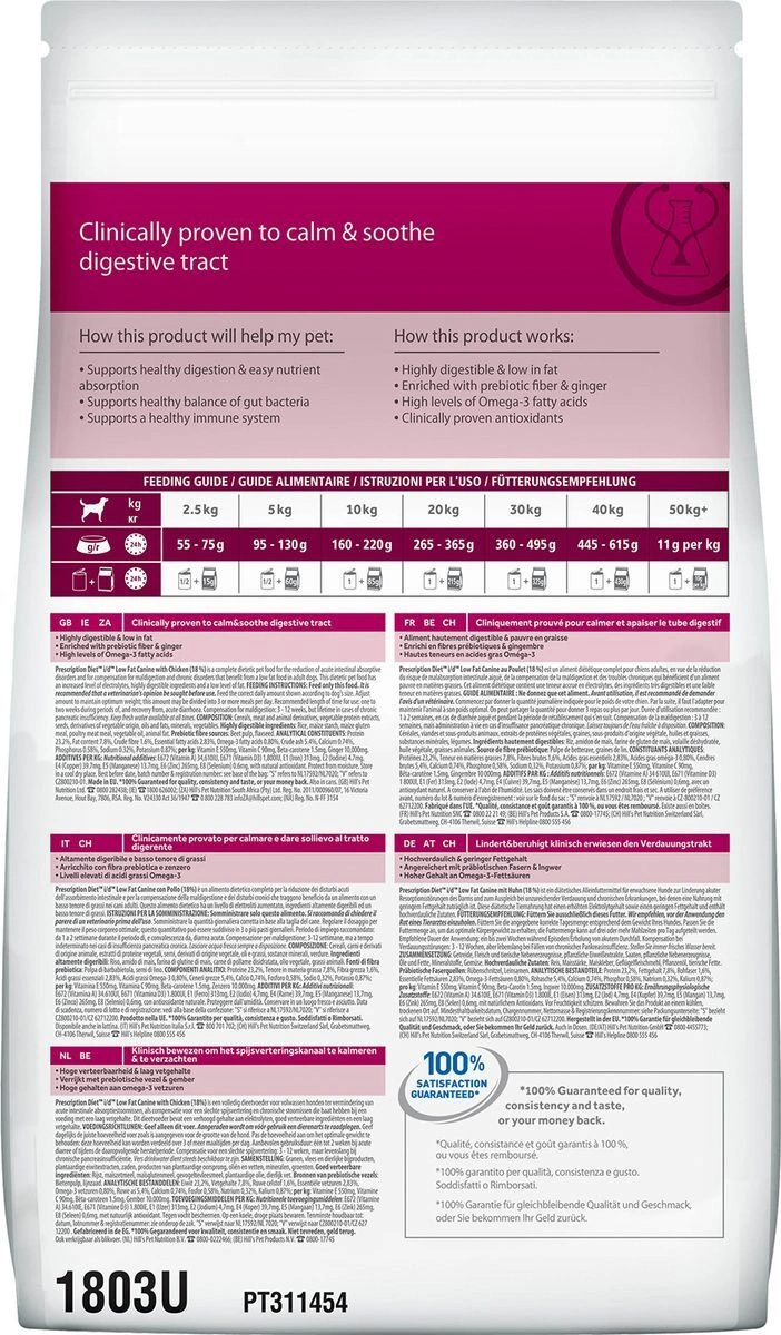 Сухой корм для собак Hill's "I/D" - полноценный диетический рацион при острых кишечных абсорбативных расстройствах, для компенсации дефицита нутриентов (питательных веществ), при нарушении пищеварения и экзокринной недостаточности поджелудочной железы у собак. Рацион содержит повышенный уровень электролитов, ингредиенты высокой биологической ценности и биодоступности и пониженный уровень жира. Высокоусваиваемый рацион с низким содержанием жира для поддержания здоровья желудочно-кишечного тракта в условиях функциональных расстройств и минимизации риска из рецидивов. - Превосходный вкус понравится вашей собаке. - Пребиотические волокна обеспечивают рост полезной микрофлоры. - Добавление имбиря способствует деликатному пищеварению. Рекомендации по кормлению: рекомендуемое число кормлений: 2 раза в сутки и более. Для поддержания оптимального веса питомца суточная норма корма, обозначенная на упаковке, требует корректировки в соответствии с размерами животного. Рекомендуемая продолжительность диетотерапии при острой диарее - 1-2 недели; для компенсации дефицита нутриентов - 3-12 недель; в случаях хронической недостаточности поджелудочной железы - пожизненно. Обеспечьте питомца постоянным свободным доступом к свежей воде. Состав: мясо и пептиды животного происхождения, зерновые злаки, экстракты растительного белка, производные растительного происхождения, масла и жиры, минералы, семена, овощи. Легкоусваиваемые ингредиенты: кукуруза, рис, пшеница, мука их кукурузного глютена, мука из мяса птицы, растительное масло. Источник пребиотических волокон: мякоть сахарной свеклы, семена льна. Минеральные вещества: белок 23,5%, жир 7,3%, сырая клетчатка 1,8%, сырная зола 5,4%, кальций 0,77%, фосфор 0,62%, натрий 0,31%, калий 0,88%. На кг: витамин Е 550мг, витамин С 90 мг, бета-каротин 1,5 мг, L-карнитин 325 мг, имбирь 10 000 мг. Добавки на кг: витамин А 34 870 МЕ, витамин D3 1 810 МЕ, железо 313 мг, йод 3,1 мг, медь 39,7 мг, марганец 13,8 мг, цинк 265 мг, селен 0,6 мг. С натуральными антиоксидантами и натуральным консервантом. Товар сертифицирован.
