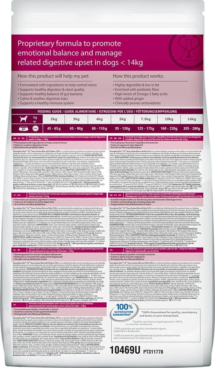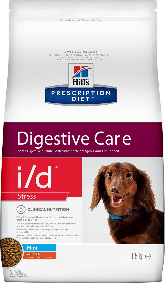Hill's Prescription Diet i/d Stress Mini Digestive Care помогает собакам мелких пород < 14 кг справиться с расстройствами пищеварения, вызванными стрессом. Ключевые преимущества:- Запатентованная анти-стресс формула для контроля стресса.- Легкоусваиваемый рацион помогает улучшить пищеварение и качество стула.- Обогащен пребиотической клетчаткой для роста полезной микрофлоры.- Содержит имбирь, который успокаивает пищеварение и улучшает моторику кишечника.Без искусственных ароматизаторов, красителей и консервантов.Назначение:- При расстройствах ЖКТ, вызванных стрессом- При колитах, вызванных стрессом- При синдроме раздраженной толстой кишки.- Обеспечивает точно сбалансированное питание для взрослых собак мелких пород <14 кг и подходит для длительного кормления.Перевод на данный рацион: Пробуете этот рацион впервые? Постепенно в течение 7 дней переводите животное на новый рацион, увеличивая его содержание по отношению к прежнему. Обеспечьте питомца свободным доступом к свежей воде.Рекомендации по кормлению: Монодиета. Не требует дополнений. Перед началом применения и о длительности кормления проконсультируйтесь с ветеринарным врачом. Суточная норма кормления указана на упаковке и должна быть рассчитана в соответствии с размером животного, чтобы поддерживать оптимальный вес; суточную норму можно разделить на 3 и более кормлений в день.Не рекомендуется: - Щенкам- Беременным и лактирующим сукам.Содержание мяса: Курица 18%Состав на упаковке: Злаки, мясо и производные животного происхождения, экстракты растительного белка, семена, производные растительного происхождения, масла и жиры, минералы, овощи, молоко и продукты молочного происхождения. Легкоусваиваемые ингредиенты: Рис, кукурузный крахмал, мука из кукурузного глютена, мука из мяса птицы, растительное масло, животный жир. Источник пребиотических волокон: Мякоть сахарной свеклы, семя льна.Анализ: Белок 23,3%, Жир 7,8%, Омега-3 жирные кислоты 0,80%, Клетчатка 1,6%, Зола 5,39%, Кальций 0,74%, Фосфор 0,58%, Натрий 0,33%, Калий 0,87%, Магний 0,09%; на кг: Витамин E 550мг, Витамин С 90мг, Бета-каротин 1.5мг, L-Карнитин 325мг, Имбирь 10 000мг, Гидролизат молочного протеина 1 000мгДобавки на кг: E672 (Витамин A) 34 610МЕ, E671 (Витамин D3) 1 800МЕ, E1 (Железо) 313мг, E2 (Йод) 4,7мг, E4 (Медь) 39,7мг, E5 (Марганец) 13,7мг, E6 (Цинк) 265мг, E8 (Селен) 0,6мг, с натуральным антиоксидантом. Калорийность (в рационе): Ккал/100 г 335Страна изготовления: ECУсловия хранения: Избегать попадания влаги. Хранить в сухом, прохладном месте, недоступном для детей и домашних животных. Вид упаковки: П/э пакетДополнительная информация: Prescription Diet i/d Stress Canine Mini c Курицей - полноценный диетический рацион для взрослых собак при острых кишечных абсорбционных расстройствах, нарушении переваривания пищи и хронических заболеваниях, при которых требуется питание с низким содержанием жира. Рацион содержит повышенный уровень электролитов, ингредиенты высокой биологической ценности и пониженный уровень жира.Для собак весом >= 14 кг возможно понадобится дополнительное введение гидролизата молочного протеина для достижения оптимального эффекта. Рекомендуется назначать, если есть вероятность стрессовой ситуации (переезд, фейрверки и салюты и т.д.) и для поддержания здоровья собак в случаях хронических заболеваний желудочно-кишечного тракта для уменьшения риска рецидивов.Другие рекомендованные рационы:- Острые 