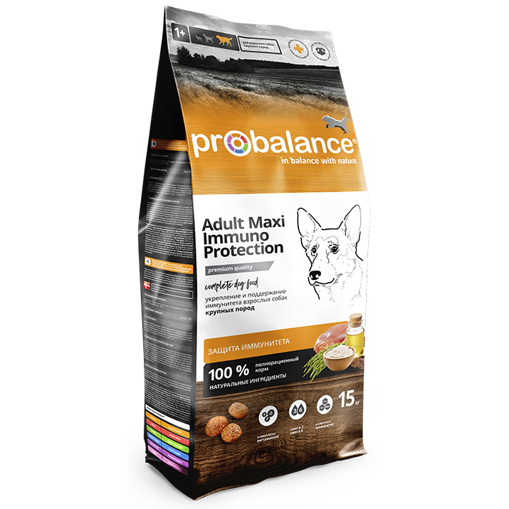 Полнорационный натуральный сухой корм премиум класса с функцией защиты иммунитета и укрепления организма животного. Корм рекомендован для ежедневного кормления взрослых собак крупных пород.Рецептура корма разработана практикующими датскими ветеринарами. В состав корма входят только натуральные ингредиенты без Е-консервантов.Лизин, содержащийся в гранулах, способствует укреплению иммунитета. Специально подобранный пребиотик поддерживает полезную микрофлору кишечника, а глюкозамин и хондроитин помогают сохранить суставы здоровыми. Оптимальный баланс питательных и минеральных веществ предотвращает возникновение заболеваний опорно-двигательного аппарата.Probalance – баланс вкуса и пользы. Сбалансированный рацион на каждый день с учетом возраста, активности и темперамента животного.Состав: дегидратированное мясо птицы 26%, рис, ячмень, куриный жир, овес, натуральные вкусоароматические добавки, дрожжи (источник витаминов группы В), льняное семя (источник Омега-3 и Омега-6 жирных кислот), фито-композиция из целебных трав «Fitocare® for dogs», яичный порошок, жом свекольный, масло подсолнечное, витаминно-минеральная добавка для собак (витамины А, D3, Е, В1, В2, В3, В4, В5, В6, В9 (фолиевая кислота), В12, Н (биотин), железо, медь, цинк, марганец, йод, селен), жир рыбий, пребиотик, лецитин (необходим для восстановления клеток организма), лизин (помогает укреплять иммунитет), экстракт Юкки Шидигера (снижает запах фекалий), глюкозамин, хондроитин (здоровая работа суставов), L-карнитин (способствует сжиганию жиров в организме). Добавки, сохраняющие продукт: мико карб, натуральные антиоксиданты (смесь токоферолов).Энергетическая ценность: 364 ккал / 100 гГарантируемые показатели: протеин – 25%, жир – 13%, клетчатка – 3,5%, зола – 5,5%, влажность – 10%, кальций – 1%, фосфор – 0,8%, витамин А – 15000 МЕ/кг, витамин D – 1500 МЕ/кг, витамин Е – 50 мг/кг