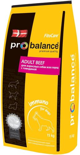 Корм ProBalance "Immuno Adult Beef" премиум класса предназначен для ежедневного кормления взрослых собак всех пород.L-лизин является необходимым строительным блоком для всех белков в организме, играет важную роль в абсорбции кальция , а также производстве организмом гормонов, ферментов и антител. Специально подобранный пребиотик поддерживает полезную микрофлору кишечника, а глюкозамин и хондроитин помогают сохранить суставы здоровыми. Входящая в состав корма говядина, содержит незаменимые аминокислоты и микроэлементы, полезные для поддержания здоровья организма питомца.Состав: дегидратированное мясо (в том числе из говядины, мин. 14%), рис, кукуруза, ячмень, животные жиры и растительные масла, протеины растительного происхождения, дрожжи, жом свекловичный, натуральные вкусоароматические добавки, льняное семя, яичный порошок, витаминно-минеральная добавка для собак (витамины А, D3, Е, В1, В2, В3, В4, В5, В6, В9 (фолиевая кислота), В12, Н (биотин), железо, медь, цинк, марганец, йод, селен), жир рыбий, фито-композиция «FitoCare® for dogs», лизин, пребиотик, экстракт Юкки Шидигера, глюкозамин, хондроитин. Добавки, сохраняющие продукт: мико карб, натуральные антиоксиданты (смесь токоферолов).Калорийность: 357 ккал / 100 г.Гарантируемые показатели: сырой протеин 25%, сырой жир 13%, клетчатка 3,5%, сырая зола 7,5%, кальций 1,6%, фосфор 1,1%, влажность 10%.Товар сертифицирован.