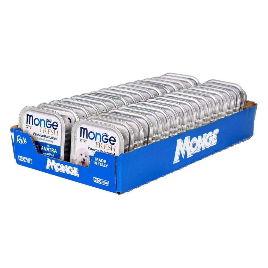 Полнорационныи? корм для собак - паштет из мяса утки.Monge Fresh — это вкусные паштеты с аппетитными кусочками отборного свежего мяса.Рекомендации по кормлению: Продукт подавать комнатной температуры или подогретый. ВАЖНО, что животное всегда имело доступ к чистой свежей воде. Собакам средних пород необходимо 5-6 упаковок продукта в день, кормление разделить на 2-3 приема.Открытую упаковку хранить в холодильнике.