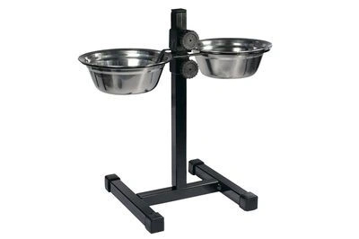 Кормушка состоит из Н-образного основания, штока высотой 40см и держателя для 2-х мисок объемом 0,7л каждая, миски изготовлены из нержавеющей стали. Кормушка легко собирается путем соединения основания и штока винтом при помощи шлицевой отвертки. Основание кормушки имеет резиновые заглушки, которые препятствуют скольжению по глянцевой поверхности, держатель для мисок имеет свободную регулировку мисок по высоте и их фиксацию при помощи специального фиксатора. Идеально подойдет для маленьких собак.