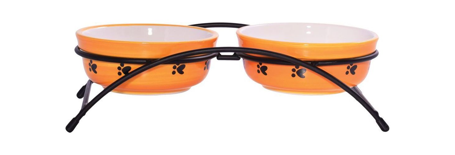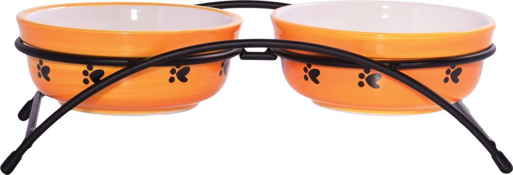 Керамические миски на подставке с интересным дизайном - стильное дополнение вашего интерьера. - 2 керамические миски на подставке; - черная металлическая подставка с порошковым покрытием; - не скользит благодаря резиновым ножкам; - объем мисок: по 290 мл каждая. Удобно использовать и легко мыть. Подходят для кошек и собак.