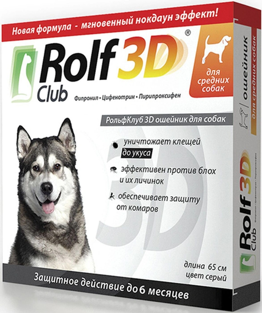 РольфКлуб 3D ошейник для собак применяют для лечения и профилактики арахноэнтомозов, вызываемых блохами, вшами, власоедами, иксодовыми клещами, защиты собак от нападения двукрылых кровососущих насекомых и профилактики трансмиссивных заболеваний (бабезиоз, боррелиоз, дирофиляриоз).Противопоказанием к применению РольфКлуб 3D ошейника для собак является индивидуальная повышенная чувствительность животного к компонентам препарата. Не следует применять препарат больным инфекционными болезнями и выздоравливающим животным, а также щенкам моложе 3-месячного возраста. Применение ошейника беременным и кормящим животным возможно после консультации с ветеринарным врачам.Используют для уничтожения блох, вшей, власоедов и иксодовых клещей, паразитирующих на собаках, а также для защиты животных от их нападения.РольфКлуб 3D ошейник для собак содержит в качестве действующих веществ фипронил - 5%, d-цифенотрин - 5%, пирипроксифен - 2% и вспомогательные вещества: поливинилхлорид-С-70-59-М - 40%, мел - 20%, ди-(2-этилгексил)-фталат (ДОФ) - 17,3%, масло эпоксидированное соевое - 6%, краситель Pigment Concentrate Master batch Name 6314 (Grey) - 2%, кальция стеарат - 0,9%, свинец сернокислый трехосновной - 0,9% и диоксид титана - 0,9%.