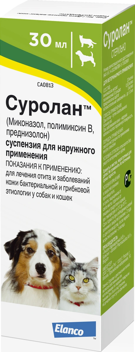 Elanco Суролан 30 мл Показания: для лечения отитов у собак и кошек бактериальной, грибковой и паразитарной этиологии. Применение и дозировка: 3 — 5 капель препарата в каждое ухо два раза в день беспрерывно до наступления периода нескольких дней после исчезновения клинических симптомов.