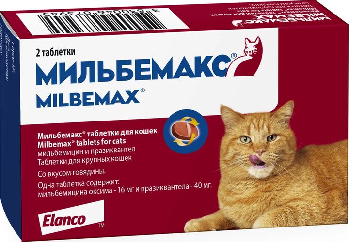 Антигельминтный препарат Elanco Мильбемакс для кошек, 2 таб. Антигельминтное нетоксичное средство широкого спектра действия. Относится к группе умеренно опасных для теплокровных животных соединений и в рекомендуемых дозах не оказывает сенсибилизирующего, эмбриотоксического и тератогенного действия. Прекрасно переносится кошками разных пород и возрастов.Препарат применяют кошкам однократно во время кормления с небольшим количеством корма или вводят принудительно на корень языка после кормления в минимальной терапевтической дозе 2 мг мильбемицина оксима и 5 мг празиквантела на 1 кг массы животного.
