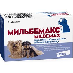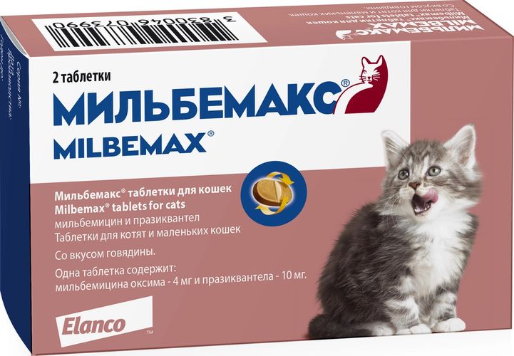 Elanco Мильбемакс антигельминтик для котят и молодых кошек 2 таб. Эффективное антигельминтное средство широкого спектра действия. Таблетки от глистов назначают кошкам с лечебной и профилактической целью при нематодах, цестодозах и смешанных нематодо-цестодозных инвазиях, вызванных гельминтами следующих видов: Dipylidium caninum, Taenia spp., Echinococcus multilocularis (цестоды), Ancylostoma tubaeforme, Toxocara cati (нематоды).Способ применения и дозы: препарат применяют кошкам однократно во время кормления с небольшим количеством корма или вводят принудительно на корень языка после кормления в минимальной терапевтической дозе 2 мг мильбемицина оксима и 5 мг празиквантела на 1 кг массы животного.