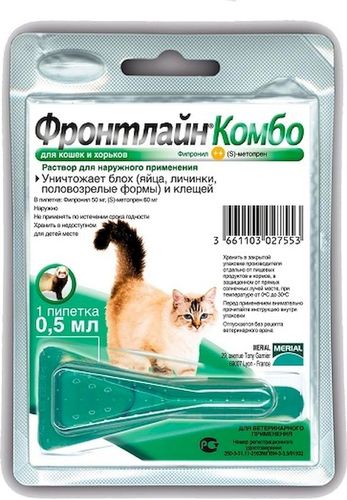 Показания: для борьбы с взрослыми и преимагинальными стадиями эктопаразитов. Состав: в качестве действующих вещества фипронил-9,8% и S-метопрен- 8,8%, а в качестве вспомогательных веществ - поливидон и полисорбат. Применение и дозировка: однократное топикальное нанесение на кожу раз в месяц пипетки соответствующей весу животного. Не рекомендуется мыть животных в течение 48 часов после обработки, а также использовать другие инсектоакарицидные средства. Частота обработки: 1 раз в 4 недели.