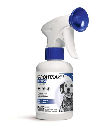 Показания: назначают кошкам и собакам против эктопаразитов (блох, вшей, власоедов, иксодовых клещей, хейлетиелл). Состав: действующего вещества 0,25% фипронила (C12H4CL2F6N4OS) и вспомогательные компоненты. Применение и дозировка: наружно 3 – 6 мл на 1 кг массы животного в зависимости от длины шерсти. Частота обработки: 1 раз в 4 недели.