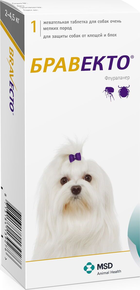 Intervet Бравекто жевательная таблетка для собак 2-4,5кг 112,5мг Показания: для защиты собак от клещей и блох. Состав: действующее вещество, в 1 таблетке флураланер: 112,5 мг для собак массой 2 — 4,5 кг; 250,0 мг для собак массой >4,5 — 10 кг; 500,0 мг для собак массой >10 — 20 кг; 1000,0 мг для собак массой >20 — 40 кг; 1400,0 мг для собак массой >40 — 56 кг. Применение и дозировка: 1 таблетка для перорального применения раз в 3 месяца