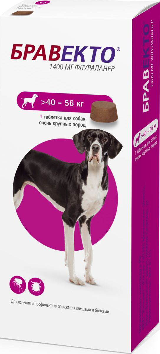 Intervet Бравекто жевательная таблетка для собак 40-56кг 1400мг Показания: для защиты собак от клещей и блох. Состав: действующее вещество, в 1 таблетке флураланер: 112,5 мг для собак массой 2 — 4,5 кг; 250,0 мг для собак массой >4,5 — 10 кг; 500,0 мг для собак массой >10 — 20 кг; 1000,0 мг для собак массой >20 — 40 кг; 1400,0 мг для собак массой >40 — 56 кг. Применение и дозировка: 1 таблетка для перорального применения раз в 3 месяца