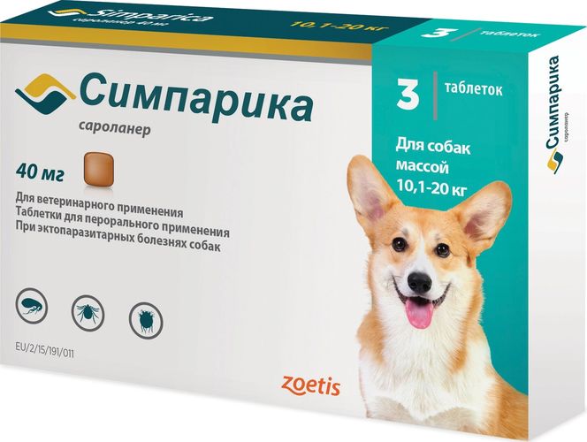 Жевательные таблетки Zoetis Симпарика, для собак весом от 10-20 кг, 40 мг, 3 шт
