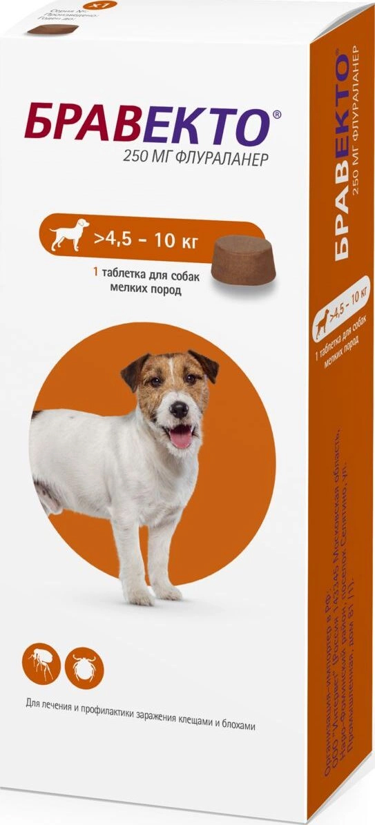 Intervet Бравекто жевательная таблетка для собак 4,5-10кг 250мг Показания: для защиты собак от клещей и блох. Состав: действующее вещество, в 1 таблетке флураланер: 112,5 мг для собак массой 2 — 4,5 кг; 250,0 мг для собак массой >4,5 — 10 кг; 500,0 мг для собак массой >10 — 20 кг; 1000,0 мг для собак массой >20 — 40 кг; 1400,0 мг для собак массой >40 — 56 кг. Применение и дозировка: 1 таблетка для перорального применения раз в 3 месяца