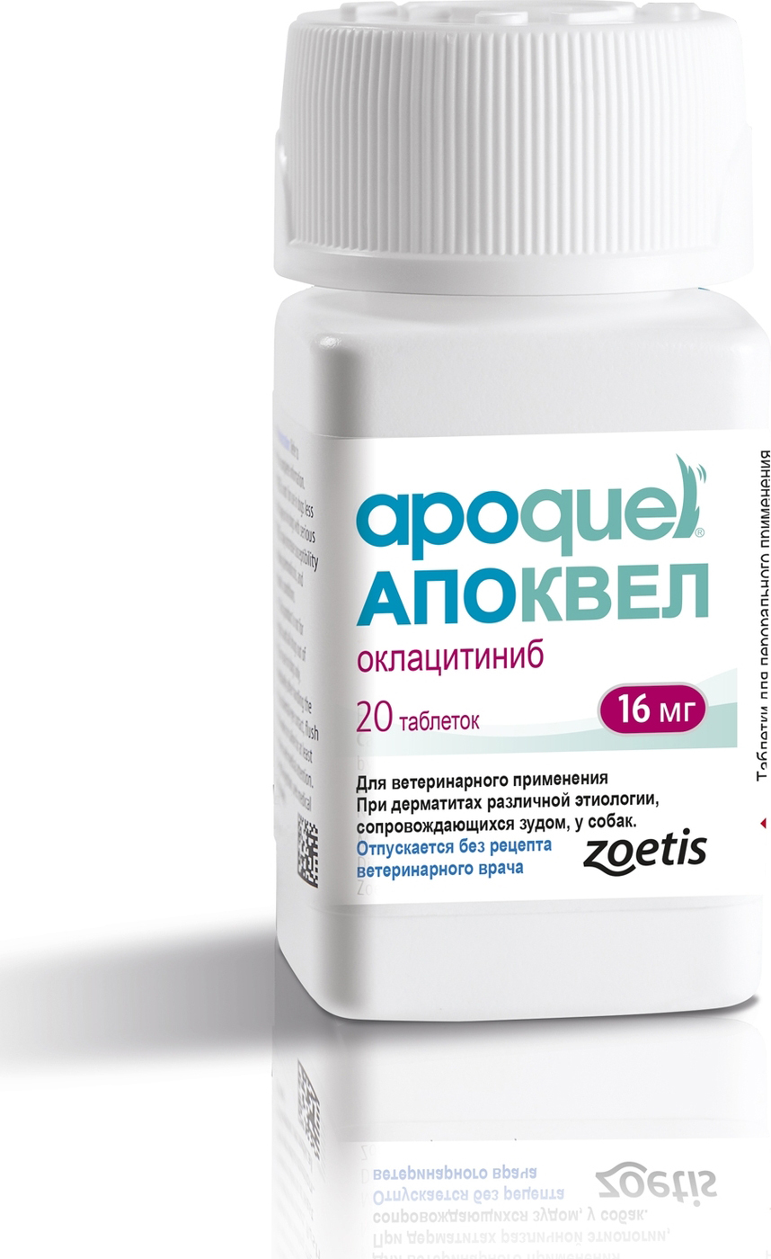 Препарат в таблетках для собак для контроля симптомов зуда и воспаления кожи при дерматите, ассоциированном с аллергией (контактной, пищевой, паразитарной), а также для лечения и профилактики рецидивов атопического дерматита.Действующее вещество – ОклацитинибДозировка 0,4-0,6 мг/кг два раза в сутки в течение 14 суток. С 15 дня – один раз в сутки в той же дозе.Компания производитель: Зоэтис (США). Препарат разработан для собак весом от 3 кг и возрастом от 12 месяцев. Применяется при аллергии любой этиологии для контроля симптомов зуда и воспаления. Максимальная концентрация оклацитиниба в крови менее, чем через 1 час. Действие препарата по снижению зуда начинается в среднем через 4 часа после дачи таблетки*. Можно проводить терапию Апоквелом параллельно с проведением диагностики аллергических заболеваний, сопровождающихся зудом. Препарат Апоквел совместим с большинством лекарственных средств. Его можно назначать совместно с антибактериальными, противопаразитарными, противогрибковыми средствами, нестероидными противовоспалительными препаратами (НПВС). Апоквел хорошо усваивается не зависимо от приема пищи. Необходимо убедиться, что собака полностью проглотила таблетку. Следует избегать пропусков приема препарата, так как это может привести к снижению эффективности. Хорошо переносится собаками. Длительность курса лечения зависит от диагноза и клинического состояния животного и определяется ветеринарным врачом.Не допускается применение Апоквела собакам в период вязки, беременности и лактации, а также собакам младше 12 месячного возраста и весом менее 3 кг.
