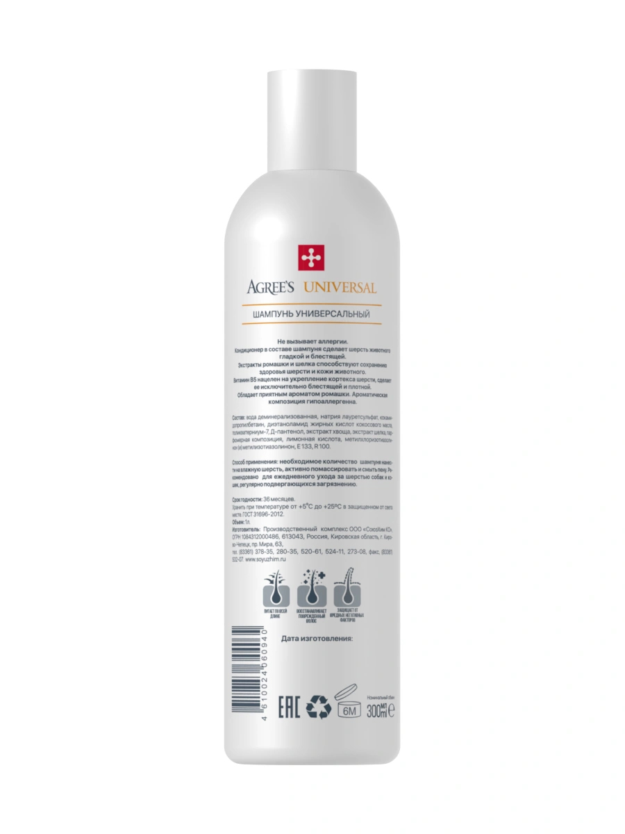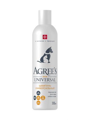AGREE'S UNIVERSAL -Универсальный шампунь "Agree's for pets" прекрасно очищает шерсть от загрязнений. Помогает сохранить природный баланс кожи и шерсти. Идеально подходит для собак и кошек всех возрастов и пород. Специально подобранная формула шампуня обеспечит тщательный и бережный уход за кожей и шерстью животного. Экстракты березы, хвоща, ромашки и пшеницы способствуют сохранению здоровья шерсти и кожи животного. Комплекс витаминов группы «В» в его составе нацелен на восстановление жизненного тонуса волосяного покрова и кожи. Укрепляет кортекс шерсти и делает ее исключительно блестящей и плотной. Легко смывается. Безопасен для ежедневного использования. БЕЗ отдушки.