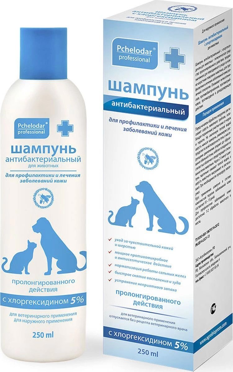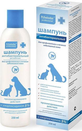 Шампунь Антибактериальный пролонгированного действия с хлоргексидином-5% и экстрактом прополиса предназначен для профилактики и лечения заболеваний кожи животных. Входящий в состав хлоргексидина биглюконат-5% оказывает широкий бактерицидный спектр действия на микроорганизмы, вызывающие различные кожные заболевания у животных. Экстракт прополиса препятствует размножению бактерий, обладает выраженным фунгицидным (противогрибковым), противовоспалительным, обезболивающим, противозудным и ранозаживляющим действием. Аллантоин оказывает успокаивающее, защитное, смягчающее и увлажняющее действие на кожу и волосы, стимулирует заживление ран и обновление клеток эпидермисахлогексидина биглюконат (5%), экстракт прополиса, экстракты лекарственных трав (зверобоя, крапивы и ромашки), экстракты морских водорослей (ламинарии и фукуса), провитамин В5, а также вспомогательные компоненты