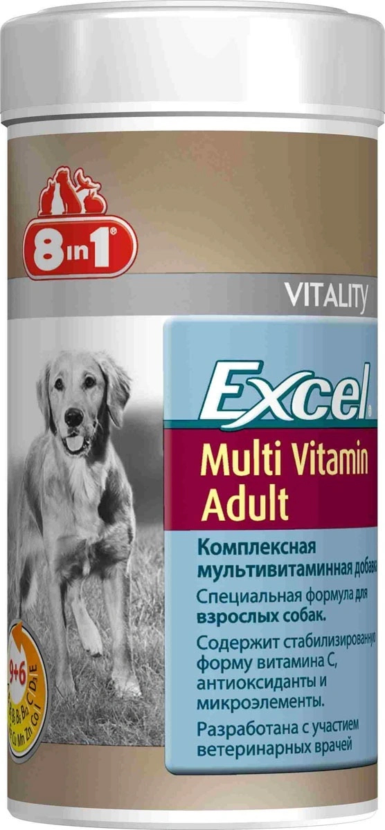 Комплексная витаминно-минеральная добавка, специально разработанная для удовлетворения потребностей взрослых собак. Сбалансированная формула необходимых витаминов и микроэлементов помогает предотвратить проблемы, связанные с неполноценностью рациона и помогает вам сохранять собаку активной и здоровой.• Комплексная мультивитаминная добавка• Специальная формула для взрослых собак всех пород• Содержит стабилизированную форму витамина С, антиоксиданты и микроэлементы для здорового и активного образа жизни вашего питомца• Восполняет дефицит питательных веществ врационе• Разработан при участии ветеринарных врачей. Применение:Дозировка: 1/2 таблетки в день для собак весом меньше 4 кг, 1 таблетка для собак весом от 4 до 20 кг, 2 таблетки в день для собак весом более 20 кг.Состав: пивные дрожжи (Saccharomyces cerevisiae), мука из зародышей пшеницы, дикальцийфосфат дигидрат, лактоза, стеариновая кислота, масло из зародышей кукурузы, сахарная пудра, глицерин, натрия хлорид, диоксид кремния, сухое обезжиренное молоко, сухая молочная сыворотка. Не содержит искусственных консервантов и красителей.Пищевая ценность: сырой белок - 26%, сырой жир - 7%, сырая клетчатка - 0,5%, зола - 15%, влага - 8%.Витамины: витамин А 240000 МЕ/кг, витамин D3 40000 МЕ/кг, витамин Е 700 мг/кг, витамин В1 300 мг/кг, витамин В2 320 мг/кг, витамин В6 32 мг/кг, витамин В12 74 мг/кг, витамин С 1300 мг/кг, никотинамид 3830 мг/кг.Микроэлементы: железо 365 мг/кг, медь 14 мг/кг, марганец 25 мг/кг, цинк 565 мг/кг, кобальт 6 мг/кг, йод 21 мг/кг.Количество таблеток: 70 шт. Товар сертифицирован. Уважаемые клиенты! Обращаем ваше внимание на возможные изменения в дизайне упаковки. Поставка осуществляется в зависимости от наличия на складе.
