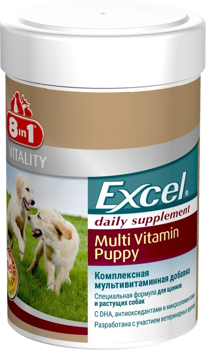 Мультивитамины для щенков 8 in 1 "Excel. Multi Vitamin" - это комплексная витаминно-минеральная добавка, специально разработанная для потребностей щенков и растущих собак. Сбалансированная формула витаминов и микроэлементов помогает предотвратить проблемы, связанные с неполноценностью рациона и активно поддерживает щенков в период их роста. Специальная формула для щенков и растущих собак: - Поливитаминный комплекс содержит 11 витаминов и 10 минералов, особенно необходимых щенкам для их правильного роста и здорового развития. - Особое внимание в составе препарата уделено микроэлементам, катализаторам обмена веществ растущего организма, что положительно сказывается на работе внутренних органов и на функциях кроветворной, нервной, эндокринной и прочих систем. - Пропорция содержания кальция и фосфора оптимальна для развития крепких костей и зубов, линолевая кислота поддерживает здоровье кожи и шерсти. - Антиоксиданты (витамины Е и С) укрепляют иммунитет. - Омега-3 жирные кислоты помогают щенку гармонично развиваться и усваивать необходимые жирорастворимые витамины. - Цинк, магний и витамины группы В повышают стрессоустойчивость организма. - Обеспечивает поступление докозагексаеновой кислоты (DHA), стимулирующей умственное развитие щенка и формирования здоровой нервной системы. - Продукт разработан при участии ветеринарных врачей. Применение: Добавку давать щенкам (с 21 дня до 18 месяцев) и молодым собакам, весом менее 4 кг - по 1 таблетке в день, более 4 кг - по 2 таблетки в день (перед кормлением). Больным, выздоравливающим, беременным и кормящим собакам давать по 2 таблетки в день. Рекомендуемый курс применения 14-30 дней. Изменения дозировки или повторный курс по показаниям. Состав: дикальцийфосфат дигидрат, пивные дрожжи (Saccharomyces cerevisiae), мука из зародышей пшеницы, кальция карбонат, глицерин, стеариновая кислота, сафлоровое масло, рыбная мука, масло тунца, натрия хлорид, диоксид кремния, лактоза, сухое обезжиренное молоко, сухая молочная сыворотка. Не содержит искусственных консервантов и красителей. Пищевая ценность: сырой белок - 15%, сырой жир - 4,5%, сырая клетчатка - 1%, зола - 37%, влага - 8%. Витамины: витамин А 550000 МЕ/кг, витамин D3 80000 МЕ/кг, витамин Е 1400 мг/кг, витамин В1 500 мг/кг, витамин В2 600 мг/кг, витамин В6 64 мг/кг, витамин В12 150 мг/кг, никотинамид 7300 мг/кг, фолиевая кислота 150 мг/кг, биотин 17500 мг/кг, пантотеновая кислота 130 мг/кг. Микроэлементы: железо 1350 мг/кг, медь 42 мг/кг, марганец 74 мг/кг, цинк 1836 мг/кг, кобальт 12 мг/кг, йод 43 мг/кг. Количество таблеток: 100 шт. Условия хранения: хранить при комнатной температуре в плотно закрытой упаковке. Вес каждой таблетки (в среднем): 1,3 г. Товар сертифицирован.