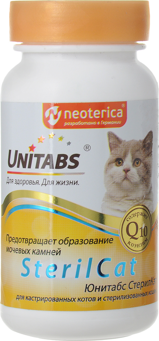 Unitabs "SterilCat" – это витаминно-минеральный комплекс предназначен для кастрированных котов и стерилизованных кошек, он содержит коэнзим Q10 и все необходимые витамины, макро- и микроэлементы. Витамины Unitabs "SterilCat" улучшают работу мочевыделительной системы, предотвращают образование мочевых камней (струвитов), Профилактируют ожирение. Порядок применения: с 8 месячного возраста, ежедневно 1 таблетку на 1 кг массы тела. Курс применения не ограничен. Состав: сухое обезжиренное молоко, DL-метионин, минеральный премикс, витаминный премикс, желатин, таурин, аэросил А, L-каротин, стеарат кальция, коэнзим Q10. Товар сертифицирован.